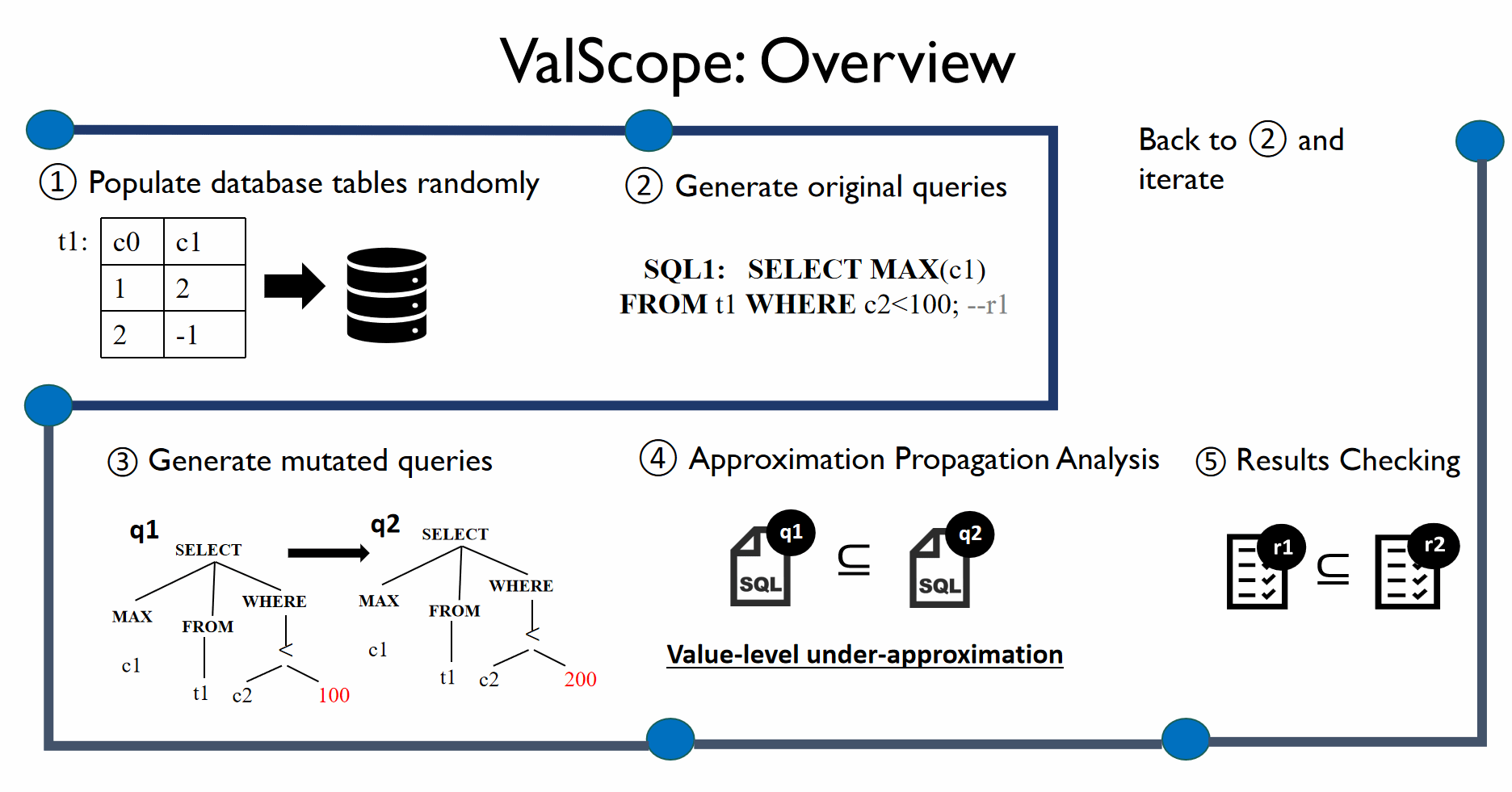 针对这一关键挑战,论文提出了一种新的统一语义建模方法,将数据库查询的集合语义与值语义结合起来分析。具体来说,集合语义关注查询结果中“有哪些元组被返回”,值语义则进一步关注“这些元组上的聚合值、表达式结果是否按照预期发生变化”。基于这一思想,作者提出了 SQL Query Approximation 模型,并进一步设计实现了自动化测试工具 VALSCOPE。该工具采用“生成—变异—验证”的整体流程,先自动生成结构丰富的 SQL 查询,再基于预定义变异器对查询中的谓词、聚合函数、表达式等局部结构进行变异,随后通过语义传播分析推导局部变异对整条查询语义的全局影响,最后通过执行原始查询与变异查询并比较结果关系,自动判断数据库系统中是否存在逻辑错误。
