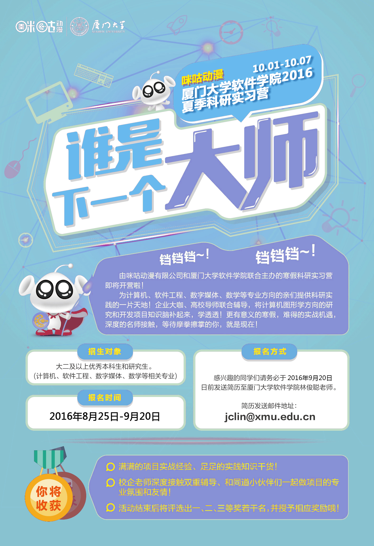 有意者请于2016年9月20日前发送简历至厦门大学软件学院林俊聪老师。jclin@xmu.edu.cn