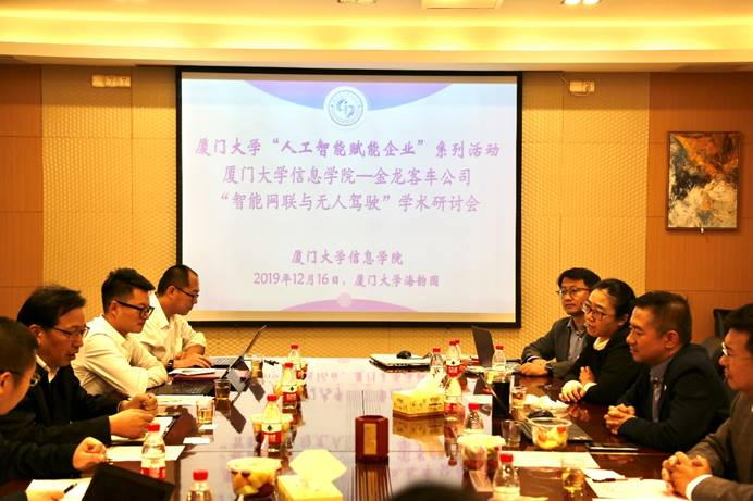 2019年12月16日下午,厦门大学人工智能赋能企业”系列活动之走进领军企业金龙客车公司暨“智能网联与无人驾驶”学术研讨会在厦大海韵校区行政楼C610会议室隆重举行。出席本次会议的领导和专家包括,金龙客车公司技术总监陈卫强、中共金龙客车公司第十五党支部书记柯永瑞,信息学院副院长(主持工作)王程教授、计算机系主任王菡子教授、计算机系教工党支部书记曲延云教授等,信息学院教师代表以及金龙客车各部门骨干共三十余人参加本次会议。活动由计算机系范晓亮高工主持。