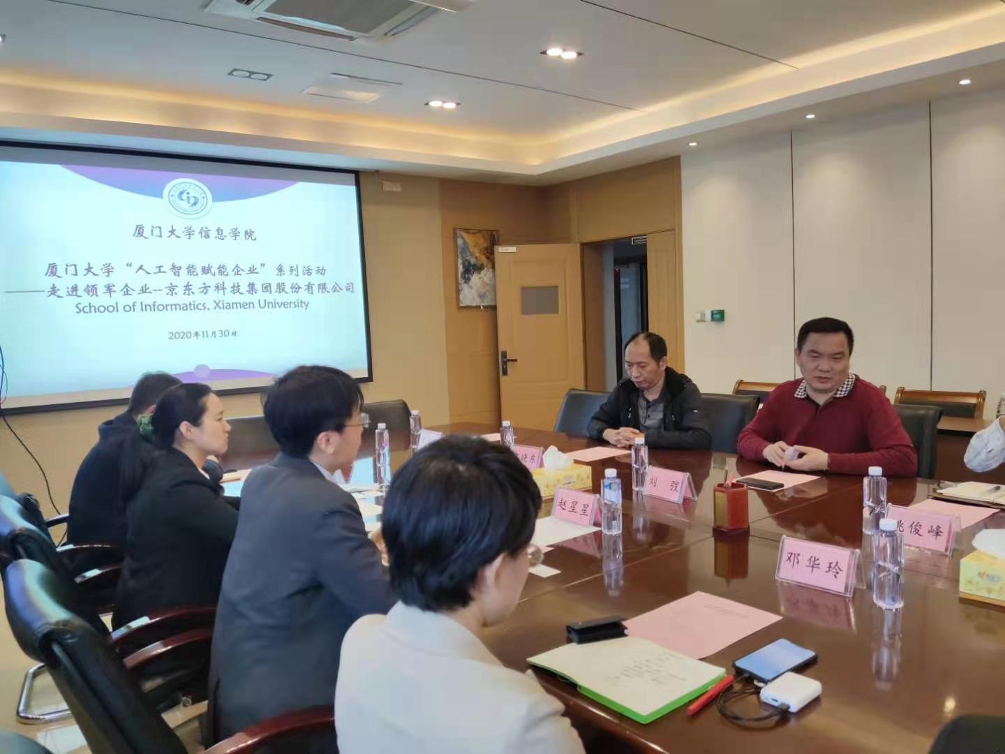 11月30日下午,信息学院“人工智能赋能企业”系列活动之走进领军企业京东方科技集团股份有限公司在厦门大学海韵校区行政楼C610会议室成功举办。京东方一行九人到访我院。我院党委书记刘弢、副院长姚俊峰教授、各系主任或副主任及其他教师代表参与了此次座谈。