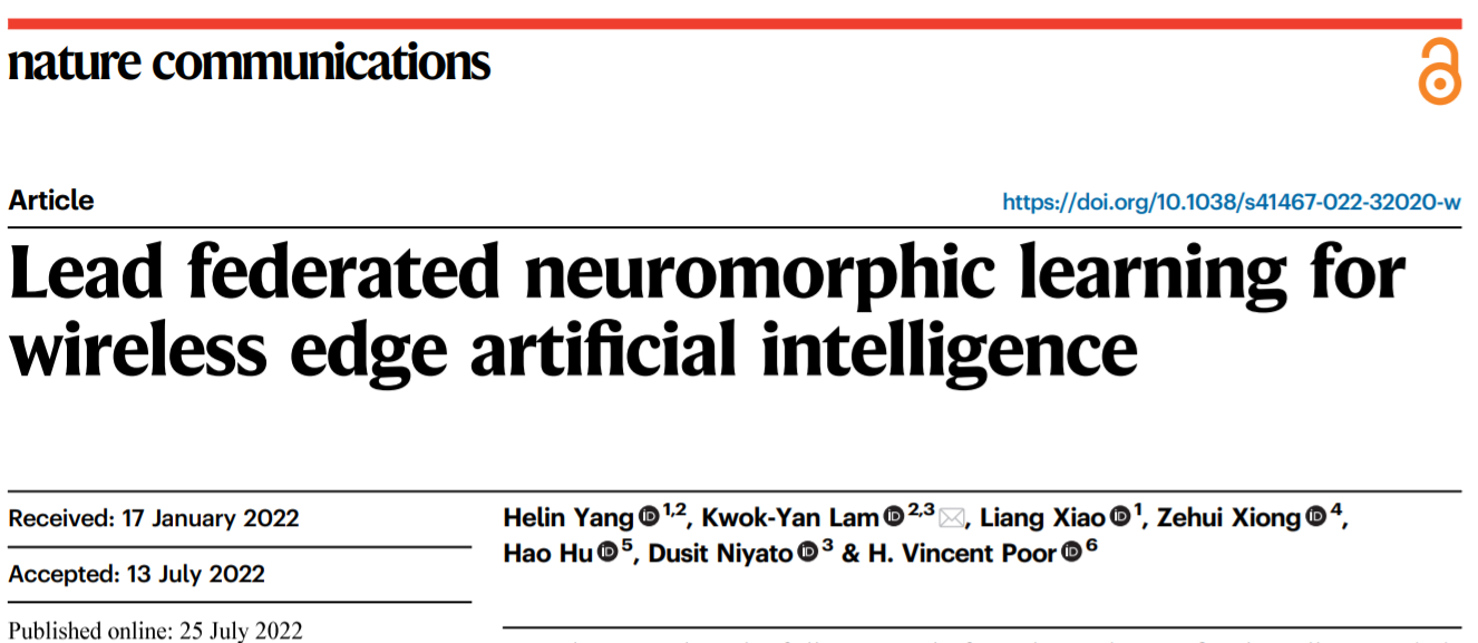 近日,厦门大学信息学院杨和林副教授、肖亮教授,新加坡南洋理工大学Kwok-Yan Lam教授、Dusit Niyato教授、Hao Hu博士,新加坡设计大学Zehui Xiong教授和普林斯顿大学H. Vincent Poor教授合作,在智能边缘计算和无线网络研究取得重要进展,共同完成的科研成果“Lead federated neuromorphic learning for wireless edge artificial intelligence”,以厦门大学为第一署名单位发表于在国际期刊《Nature Communications》上。