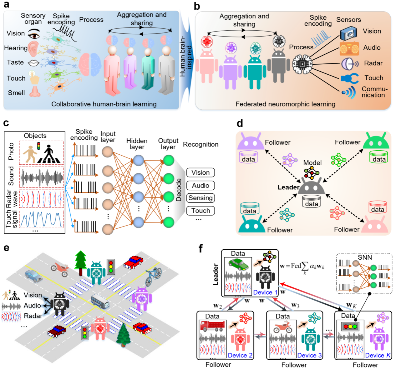 LFNL由一个组中的一个领导者和多个追随者实现(图1d),学习模型参数通过分布式网络共享和交换,每个设备在本地数据上独立训练其模型。受仿人学习功能的启发,LFNL通过使用神经形态学习训练或评估来自听觉、视觉和雷达系统的尖峰信号来实现对外界环境的感知(图1e)。