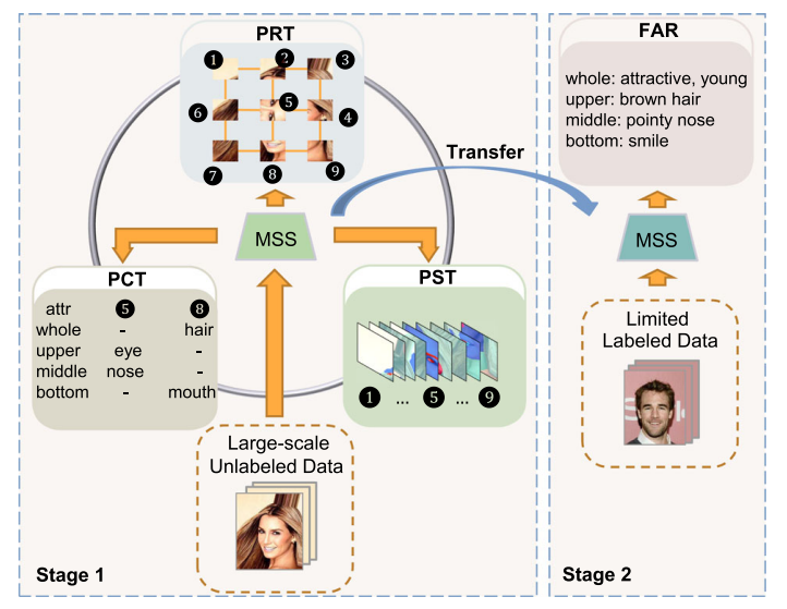该论文针对标签数据有限的人脸属性识别问题提出了一种新的空间语义图像块学习网络。该网络由一个多分支共享子网络、三个辅助任务子网络和一个目标任务子网络组成。考虑到人脸属性的多样性,多分支共享子网络包括一个任务共享分支和四个局部分支,每个分支都包含用以提取局部区域特定特征的级联的双路交叉注意力模块。该空间语义图像块学习网络涉及两个阶段的训练。在第一阶段,在大规模无标签的人脸数据上进行多任务训练从而得到预训练好的多分支共享子网络,训练任务包括三个辅助任务:(1)图像块旋转识别任务,该任务基于自监督学习对面部图像的空间信息进行编码;(2)图像块分割任,该任务利用人脸解析模型捕获面部图像的像素级语义信息;(3)图像块分类任务,该任务利用人脸解析模型捕获面部图像的图像级语义信息。通过这三个任务的联合训练,网络可以更好地提取图像中的空间语义关系。在第二阶段,基于预训练好的多分支共享子网络,我们只需少量带标签数据即可轻松微调人脸属性识别子网络以预测面部属性。