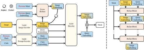 该论文提出了一种称为FocSAM的图像交互分割模型,旨在解决分割一切模型(SAM)在处理复杂样本时遇到的稳定性问题。FocSAM针对SAM的两个方面改进其性能。首先,FocSAM引入了动态窗口多头自注意力(Dwin-MSA)机制,允许模型在交互过程中通过少量的额外计算动态地将图像特征聚焦于目标对象,提高了目标所在区域的特征显著性;其次,FocSAM采用了像素级动态ReLU(P-DyReLU)以更有效地将少量的交互信息与图像特征深度融合,进一步提高模型性能。FocSAM在多个数据集上达到了当前最先进水平,并只需之前最佳方法约5.6%的CPU推理时间。