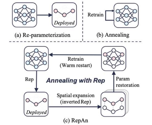 本文提出了一种利用重参数化增强的模拟退火算法,通过引入结构重参数化(Re-parameterization)的结构变换特点,对退火算法进行低开销改进。现有的退火算法存在一个问题,即忽视了不同周期之间的相关性,忽略了增量学习的潜力。本文认为这是由于固定的网络结构阻止了模型在不同训练阶段识别不同特征。为此,本文提出了RepAn,将重参数化方法改进为可逆的结构变换,并将其与退火算法相结合以增强训练。具体而言,网络在训练过程中通过重参数化压缩、结构扩展恢复的循环,在每个退火轮次中迭代这些过程,得到了更优秀的训练性能。