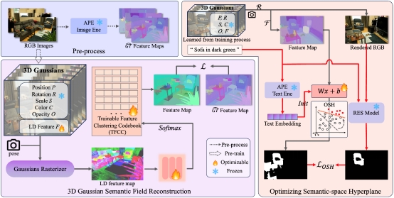 本文提出了一种新型基于三维高斯泼溅 (3D Gaussian Splatting, 3DGS)的开放词汇感知框架GOI,针对开放词汇的文本提示输入实现高精度的三维目标区域定位。为此本文提出了一种有效的语义空间压缩方法,利用场景先验将有噪声的高维语义特征压缩成紧凑的低维向量,嵌入到3DGS中。在开放词汇查询的过程中,现有方法依赖于手动设置的固定经验阈值,根据场景的语义特征和查询文本的语义特征距离来选择区域,这种方法缺乏鲁棒性。因此,本方法将特征筛选的步骤视为特征空间内的超平面划分的过程,仅保留与查询高度相关的场景语义特征。本方法利用现有的2D指向性分割模型来微调语义空间超平面,从而大大提高了三维开放词汇查询的准确性。在多个数据集上的实验证明本方法都超过了之前的最先进的方案,达到了SOTA性能。