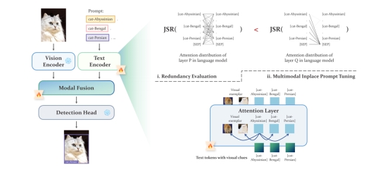 将大型语言模型集成到开放世界检测框架中,能显著提高检测器在新环境中的适应性。通过大语言模型生成的提示文本表征,有助于在开放世界检测器中为图像类别构建分类边界。然而,直接在检测系统中微调语言模型会导致冗余的注意力模式,从而产生次优的文本表征。为了充分利用大型语言模型的能力并增强其针对检测任务的编码表征,本研究引入了一种冗余评估指标,以识别冗余的注意力模式。在冗余度较高的区域,本文引入了多模态同步提示调优(MIPT),利用更具体的视觉信息丰富文本提示。实验结果验证了本文MIPT框架的有效性,在多个基准测试中取得了显著提升,例如将GLIP-L在ODinW-35上的表现从22.6%提升到25.0%,并在LVIS上取得了9.0%的性能提高。