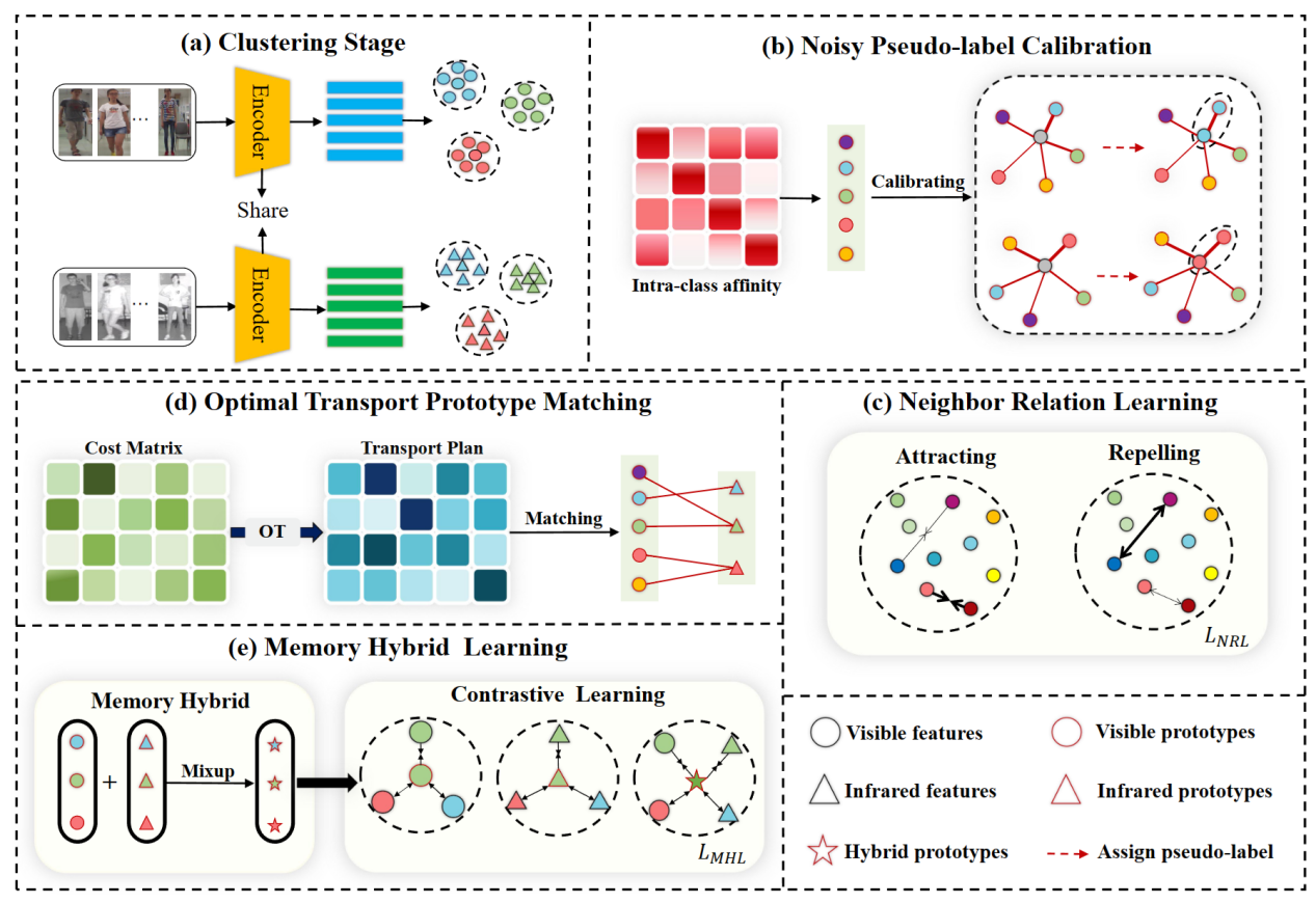无监督可见光-红外行人重识别(uSWI-&eDD)是一项极具挑战的任务,其目的是在没有任何标注的情况下匹配可见光和红外模态下的行人图像。最近,聚类伪标签方法已成为 USVI-ReID 的主要方法,但是不可靠的伪标签严重影响识别精度。为了解决这一问题,本文设计了一种基于邻居关系的鲁棒伪标签学习框架(RPNR)。具体而言,本文首先引入了一个简单而有效的噪声伪标签校准模块来校正噪声伪标签;设计了邻居关系学习模块,通过对所有样本间潜在的相互作用进行建模来降低较高的类内差异;进一步设计了最优传输原型匹配模块,以建立可靠的跨模态对应关系。在此基础上,通过内存混合学习模块,以联合学习特定模态信息和模态不变信息。在两个基准数据集(SYSU-MM01 和RegDB)上进行的综合实验表明,RPNR的性能优于当前最先进的GUR,Rank-1 性能提高了10.3%。