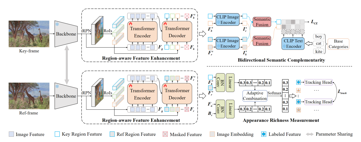针对开放词汇多目标跟踪在复杂环境中目标外观表征不明确、语义信息损失等关键问题,本文拟研究基于全局和局部感知的开放词汇多目标跟踪算法(GLATrack)。该方法能通过引入区域感知特征增强模块细化全局知识来补充局部目标信息,增强语义表示并弥合图像特征图与区域特征之间的分布差距;提出了双向语义互补策略,在知识蒸馏过程中动态选择参考帧中的有价值信息,缓解关键帧中目标信息缺失导致的语义错位问题;引入外观丰富度测量模块,为具有不同外观的目标提供适当的表示,提高模型的跟踪性能。
