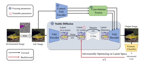 生成模型的快速进展引发了AI生成内容隐蔽(AIGC-S)这一关键任务,其目标是创建能够规避法医检测器和人工检查的AI生成图像。对这一任务展开研究对于理解现有检测方法的漏洞和开发更强大的生成技术至关重要。当前的基于对抗攻击的方法通常会引入可见噪声,具有较差的可迁移性,并且未能解决AI生成图像与真实图像之间的光谱差异。针对上述挑战,本文提出了一种基于StableDiffusion的框架StealthDiffusion,能够将AI生成的图像修改为高质量的、不易察觉的对抗性样本,从而避开最先进的法医检测器。StealthDiffusion包括两个主要组件:潜在对抗优化以及控制变分自编码器(Control-VAE),前者在稳定扩散的潜在空间中生成对抗性扰动,后者在不影响原始扩散模型生成过程的情况下,进一步减少生成的对抗性图像与真实图像之间的光谱差异。实验表明,StealthDiffusion在白盒和黑盒环境下均表现出较好的性能,能够有效地将AI生成的图像转化为频谱与真实图像相似的高质量对抗性伪造样本。这些由StealthDiffusion处理后的图像被最先进的法医分类器分类为真实图像,并且难以被人类辨别。