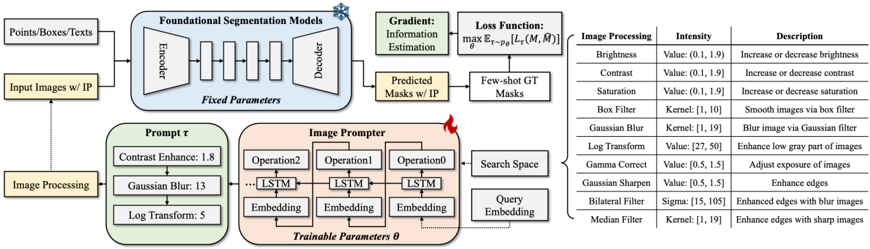 本文提出了一种创新的“prompting-to-adapt”适应性范式,通过引入图像提示器来增强基础分割模型在不同图像领域的泛化能力。该提示器利用少量样本对生成领域特定提示,并结合多样的图像处理技术提升模型适应性。针对图像提示的非微分性问题,本文设计了基于信息熵的梯度下降优化策略。在多个数据集上的实验显示,该方法有效提升了模型的适应性,并且生成的提示具有较高的可解释性,有助于深入理解图像处理机制。