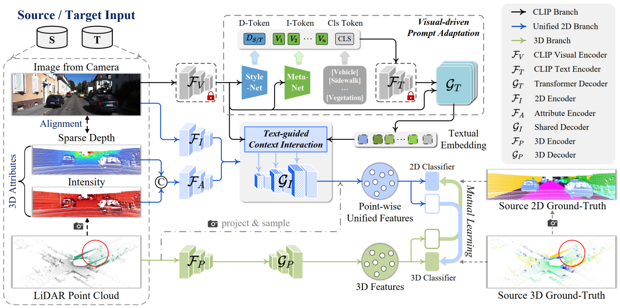 本文探索了如何利用多模态信息解决3D语义分割的域自适应问题。现有的方法通常试图通过对齐源数据和目标数据之间的特征来减轻域差异。然而,这种实现在应用于图像感知时存在不足,因为与点云相比,图像对环境变化的敏感性更高。为了解决这一问题,本文提出一种利用图像语言预训练模型(CLIP)的先验知识来提升跨域3D语义分割鲁棒性的框架 (CLIP2UDA)。首先,引入了一个视觉驱动的提示适应模块 (VisPA),通过预训练的视觉编码器生成的2D域特征,学习特定于任务的文本提示。其次,为了学习多模态域不变特征表示,提出了一个文本指导的上下文交互模块 (TexCI),通过跨解码器层进行类感知融合和语义感知融合,得到文本引导的视觉特征,然后将该特征与图像和属性特征融合,并在共享解码器中进行层次性交互,从而产生联合的视觉预测。最后,将3D特征与点级联合特征进行互学习,受益于视觉语言结构相关性,增强了多模态域不变特征的表示能力。该方法在Day/Night、USA/Singapore、vKITTI/sKITTI和A2D2/sKITTI自适应场景中显著优于目前最先进的跨模态UDA方法。