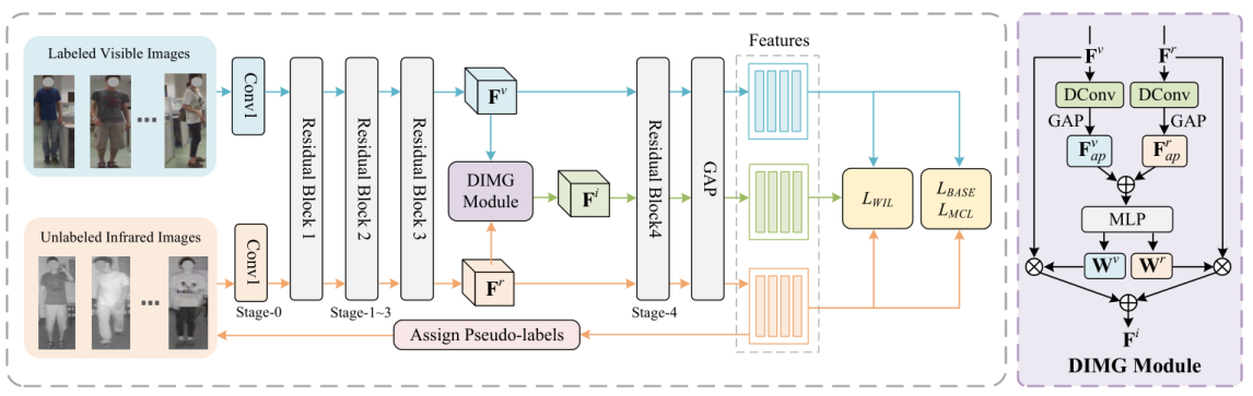 本文提出了一种新颖的模态统一与置信引导(MUCG)的半监督学习框架,致力于解决半监督可见-红外人重识别(SSVI-ReID)任务中两个关键挑战:噪声伪标签和显著的模态差异。本文首先引入了一个动态中间模态生成(DIMG)模块,该模块能够将标记可见光图像的知识迁移到未标记的红外图像上,从而增强伪标签的质量并缩小模态间的差距。同时,本文设计了一种加权身份损失(WIL),利用置信度加权策略降低模型对错误标签的依赖。此外,本文还开发了一种模态一致性损失(MCL),有效缩小了可见光和红外特征的分布距离,进一步促进了模态统一特征的学习。大量实验表明,MUCG在提升SSVI-ReID任务的性能方面具有显著优势,明显超越了现有的半监督方法。
