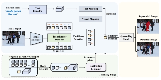 视觉定位(VG)是一项根据自然语言描述定位物体的跨模态分析任务。近期的研究致力于探索弱监督学习方法以降低标注的成本。传统弱监督方法通常采用Anchor-Text匹配范式,尽管效率较高,但基于Anchor的表示常常含有噪声且不足以充分描述物体信息,阻碍了视觉与语言模态的精准对齐。针对这一瓶颈,本文提出了QueryMatch,一种新颖的基于Query的单阶段框架,用于弱监督视觉定位。不同于以往的工作,QueryMatch使用一组Query特征来表示候选物体,更易于与目标物体建立精确的一对一关联。QueryMatch将弱监督下的视觉定位重定义为一个Query-Text匹配问题,可以通过基于Query特征的对比学习来进行优化。基于QueryMatch框架,本文进一步提出了负样本质量估计(NSQE)策略,通过主动选择高质量的Query特征来增强对比学习中负样本的语义信息,可极大地促进QueryMatch的弱监督学习效果。在两个视觉定位任务(REC和RES)的三个基准数据集RefCOCO、RefCOCO+和RefCOCOg上的实验结果展示了QueryMatch在弱监督领域的先进性能。在RefCOCO数据集弱监督REC任务上提升了5%,弱监督RES任务上提升了超过20%。