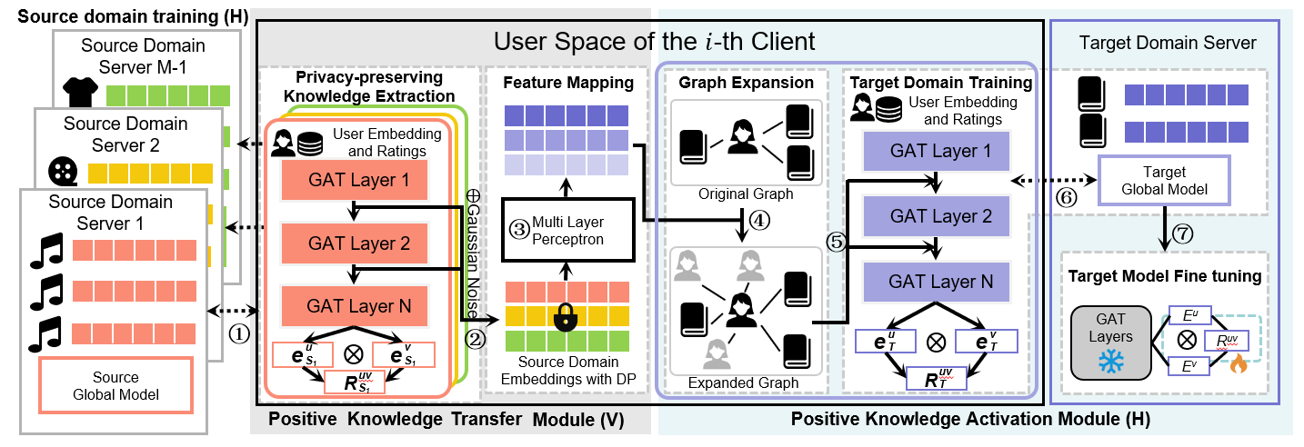 该论文提出了联邦图学习跨域推荐算法FedGCDR,该模型能够在多源域、单一目标域的跨域推荐场景上保护用户隐私,同时缓解了由隐私技术、域异质性等导致的负迁移问题,在亚马逊数据集中16个域的跨域推荐任务上性能领先。