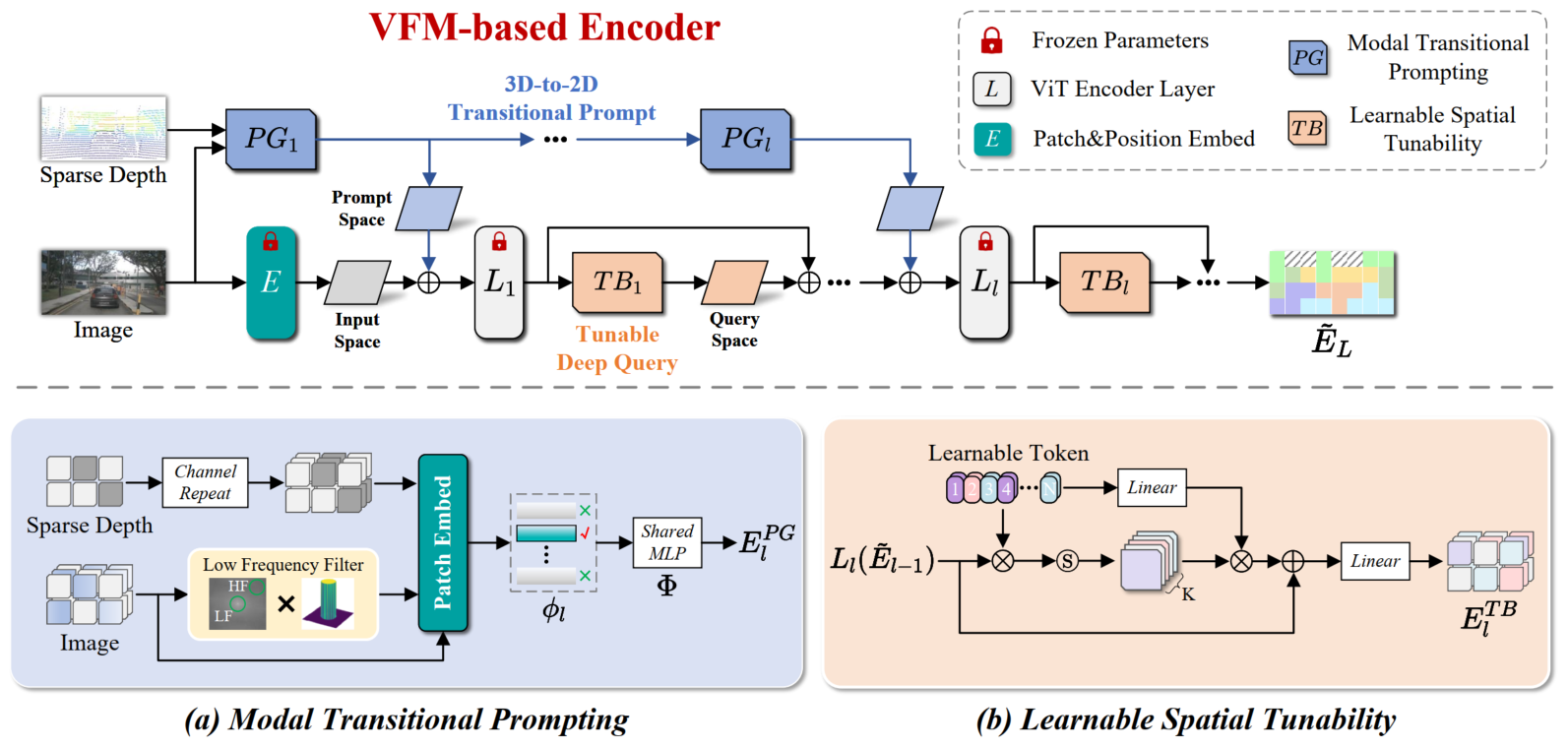 该论文探索了如何利用视觉基础模型(VFM)的先验知识来增强跨域3D语义分割。当前方法大多局限于研究单一的域泛化或域自适应策略,以解决域偏移问题。然而,这在构建缓解域偏移的通用模型方面留下了空白。因此,本文深入研究基于VFM编码器的参数高效提示微调方法,并引入一种可学习的参数启发机制,该机制不仅避免了对原始视觉空间进行不必要的操作,而且最大限度地保留了VFM对目标域数据感知的先验知识,进一步增强其泛化能力。通过在VFM编码器中分层嵌入两个轻量级模块:模态过渡性提示(MTP)和可学习空间性调整(LST),以充分学习不同层次和模态的语义理解。MTP依赖于稀疏深度的过渡性引导,在输入到编码层之前存在于提示空间中。LST依赖于向量的自定义上下文长度,存在于查询空间中,用于在编码层之后寻找匹配的提示。最后,将改进的VFM编码器集成到一个跨模态学习框架中,使2D和3D模型能够学习域不变表示,从而有效缓解多模态域偏移问题。该方法在Day/Night、USA/Singapore、vKITTI/sKITTI和A2D2/sKITTI等多个场景,和DG、DA、SFDA等多个跨域学习任务中均显著优于当前最先进的方法。