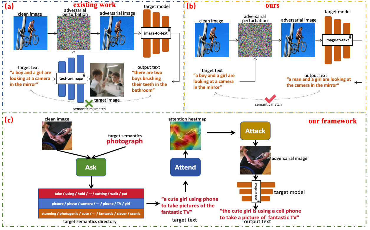 尽管图像到文本模型在各种视觉语言任务中取得了显著进展,但它们仍然容易受到对抗性攻击的影响。现有的白盒攻击对图像到文本模型需要访问目标模型的架构、梯度和参数,这导致实用性较低。尽管最近提出的灰盒攻击提高了实用性,但它们在训练过程中遭受语义损失,这限制了它们目标攻击的性能。为了推进图像到文本模型的对抗性攻击,本文关注一个具有挑战性的场景:基于决策的黑盒目标攻击,攻击者只有访问最终输出文本并旨在执行目标攻击。具体来说,本文将基于决策的黑盒目标攻击制定为一个大规模优化问题。为了有效解决优化问题,提出了一个三阶段过程——Ask,Attend,Attack,称为AAA,以求解该优化问题。Ask指导攻击者创建满足特定语义的目标文本。Attend识别图像的关键区域以进行攻击,从而减少了后续Attack的搜索空间。Attack使用进化算法攻击关键区域,这些攻击在语义上与Ask的目标文本相关,从而在没有语义损失的情况下实现目标攻击。在基于Transformer和CNN+RNN的图像到文本模型上的实验结果证实了本文提出的AAA的有效性。