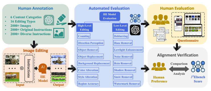 本文提出了一个名为I2EBench的综合基准,用于自动评估基于指令的图像编辑(IIE)模型生成的编辑图像的质量。针对目前IIE模型评估中的显著挑战,I2EBench从多个维度进行全面评估,旨在为其进一步发展提供有价值的见解。具体而言,I2EBench包含了2000多张待编辑图像,以及4000多条对应的原始和多样化指令。本文的创新点如下:第一,全面的评估维度:I2EBench包括16个评估维度,覆盖了高层次和低层次的各个方面,提供了对每个IIE模型的全面评估。第二,与人类感知对齐:为了确保基准与人类感知的一致性,本文针对每个评估维度进行了广泛的用户研究。第三,有价值的研究见解:通过分析现有IIE模型在16个维度上的优劣,本文提出了指导未来研究发展的重要见解。