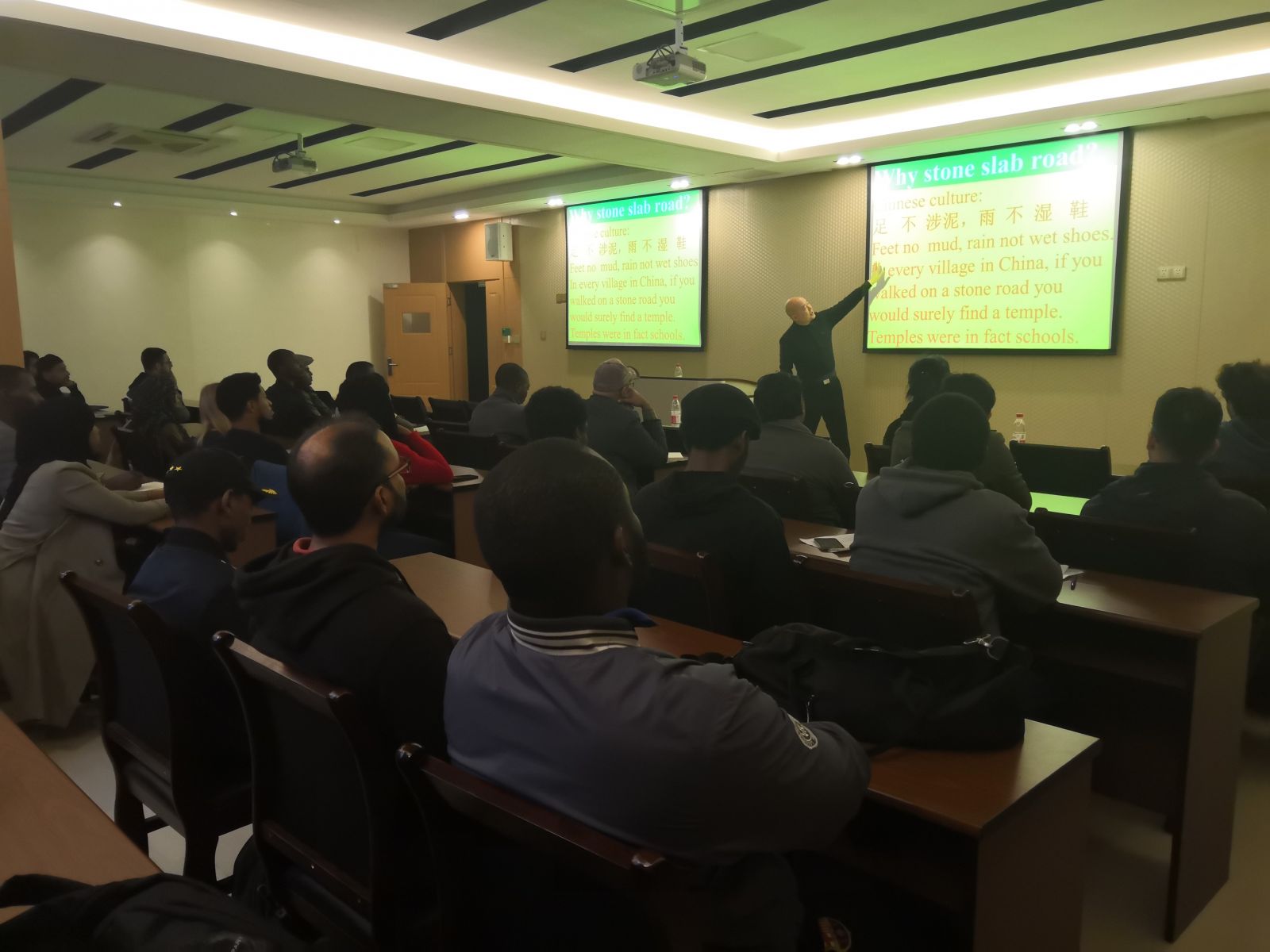 讲座由铿锵的校歌开始,留学生们在纪教授引导下用英文声情并茂哼唱。