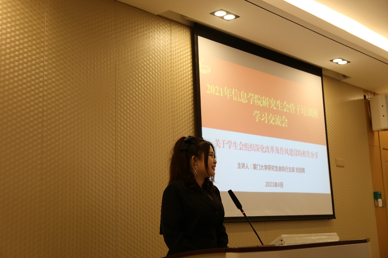 2021年4月22日信息学院于海韵行政楼C505举办了研究生会骨干培训班学习交流会,交流主题为关于学生会组织深化改革及作风建设。厦门大学研究生会执行主席刘佳桐、发展部负责人曹伟楠受邀参加了本次交流会并做相关分享。