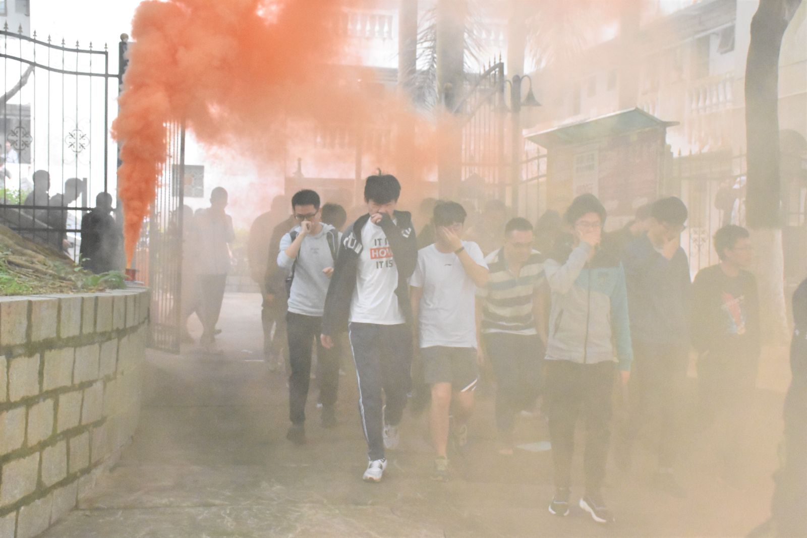 在橙色的火灾模拟烟雾中,活动拉开了序幕。大家捂住口鼻,步伐匆匆而又有条不紊地下楼加入疏散演习。学生会的同学也早早地在各个楼层站岗,帮助同学们及时有序地撤离。老师们及相关工作人员也在宿舍楼门前协助活动的顺利进行。最后大家在海韵一期食堂门前的空地进行集合,各个班清点人数,活动至此圆满结束。