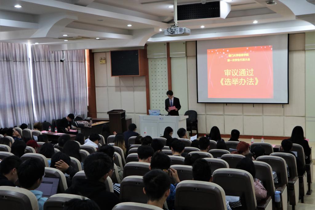 12月7日上午,我院第一次学生代表大会在海韵教学楼504报告厅隆重举行。信息学院党委副书记杨蔷,院团委书记唐腾凤,辅导员熊剑龙、陈晨,原信息科学与技术学院第十四届学生会委员、原软件学院第十七届学生会委员和全院各系各年级的学生代表等出席了此次大会。