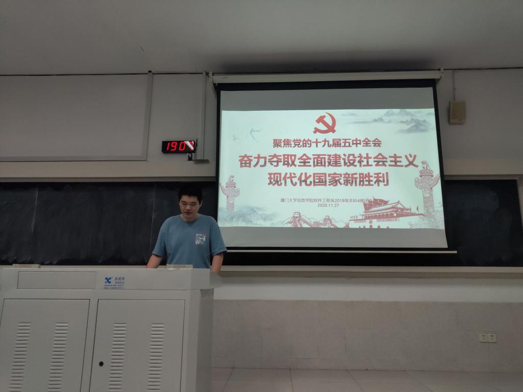 2020年11月27日晚,厦门大学信息学院软件工程系2018级四班在学生公寓教学楼205举行了“奋力夺取全面建设社会主义现代化国家新胜利——学习贯彻党的十九届五中全会精神”主题团课。班级全体同学们参加此次活动,团支书徐诚同学担任此次活动的主讲人。
