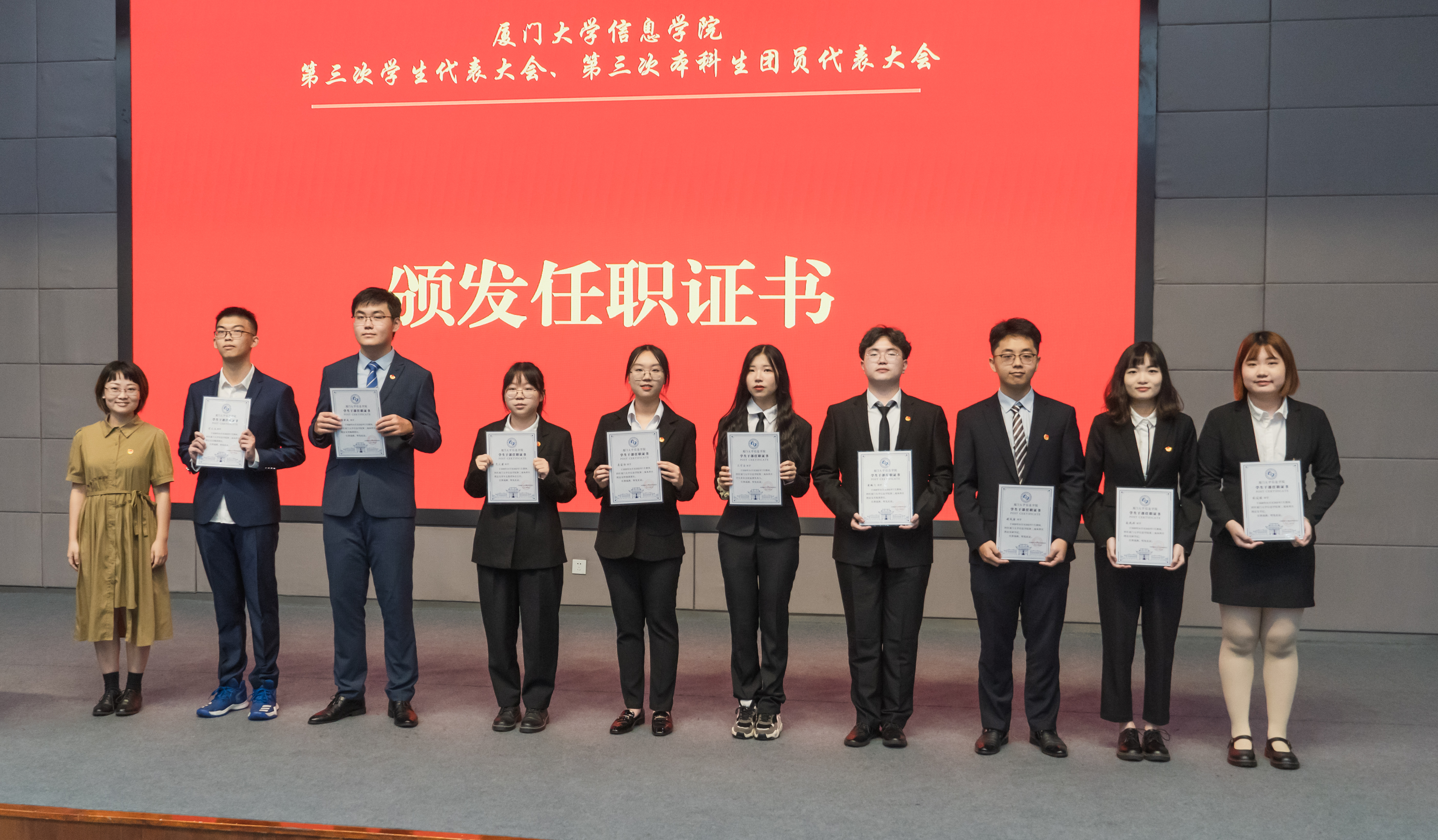 接着,学院团委副书记刘茜老师、蔡胜男老师分别为信息学院第二届学生委员会成员、第二届本科生团总支委员颁发了任职证书。