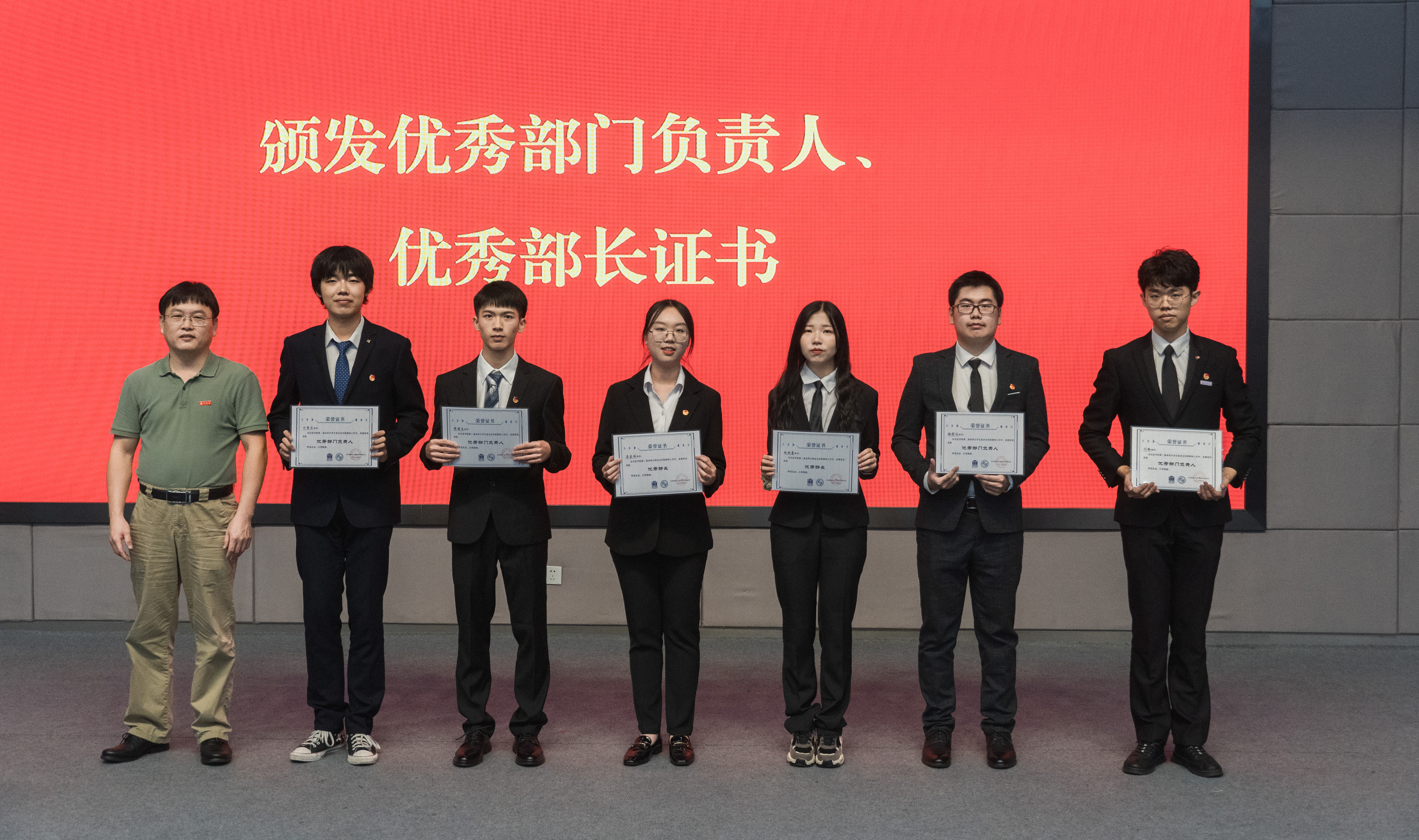 学院党委副书记郑镇锋老师为获得2020-2021学年学院学生会“优秀部门负责人”、学院本科生团总支“优秀部长”的优秀学生干部颁发证书。其中,刘畅、叶薛华、杨哲远、陈建杰获学院学生会“优秀部门负责人”荣誉称号,詹翁怡、赵欣蕾获学院本科生团总支“优秀部长”荣誉称号。