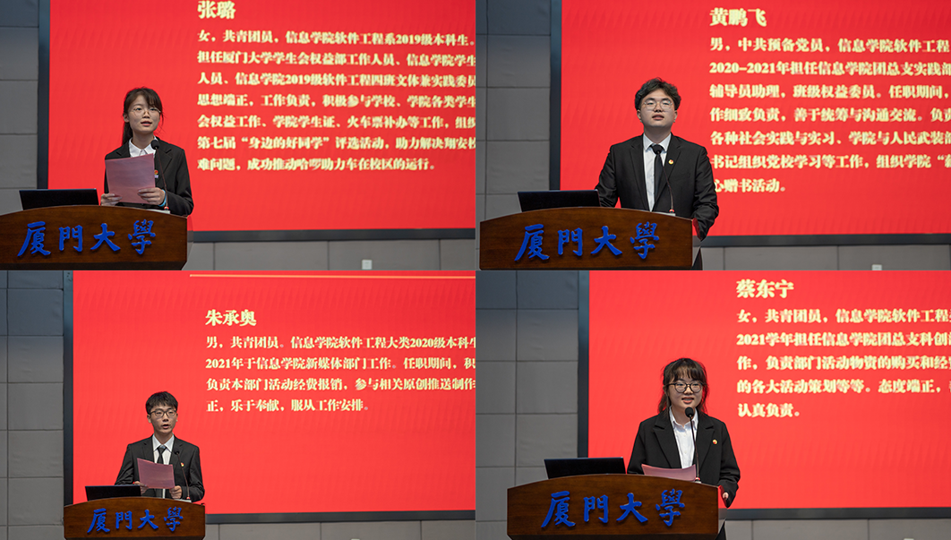 紧接着,大会进行竞选环节,候选人依次上台发表了精彩的演讲。候选人们风格不一,或发表致谢,感谢过去一年中老师、前辈及同期对自己的帮助,或回顾过去一年的学生工作经历,或提出对未来工作的设想,展现出了信息学子的昂扬风采。