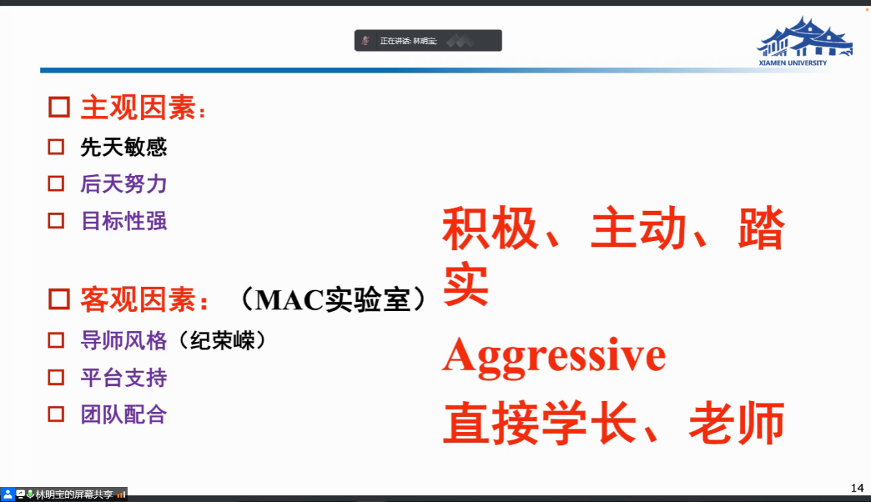 分享会环节中,林明宝同学首先介绍了自己的科研经历,分享了做好科研的主观因素与客观因素,他强调积极、主动、踏实是做任何事情的基本品质,与此同时,多与高年级同学以及老师交流是学术研究的制胜法宝之一,能够帮助大家在学习和科研的道路上“爬坡过坎”甚至弯道超车。在求职方面,林明宝认为科研成果只是作为基础能力,更重要的是需要锻炼和丰富自己的技术能力、项目经历、合作能力、带队能力、表达能力、适应能力、抗压性、耐力性、服从性。最后他强调不论工作还是科研,希望同学们能发现自己的闪光点、瞄准自己的赛道,把握当下、珍惜韶华,以坚定果敢的魄力和脚踏实地的行动成就人生高度。