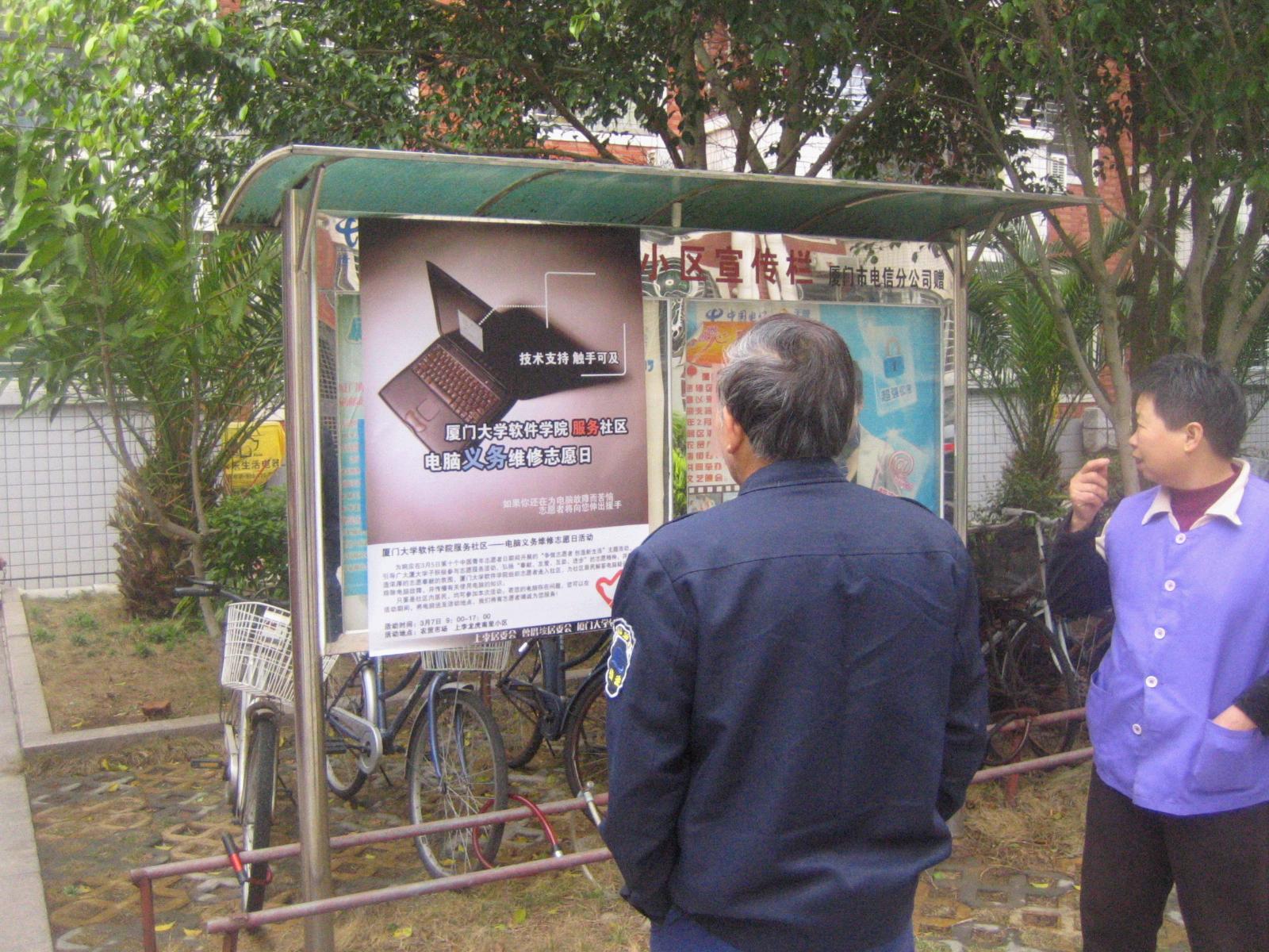 活动取得了圆满成功,一直持续到下午4点多,志愿者的热情服务和良好技术博得了社区居委会工作人员和居民们的一致好评。本次活动一共服务20多人次,其中上门服务8次,检修笔记本、台式机共30多台。活动中我们看到社区居民对电脑维修的需求还是非常大的。许多来往的居民都啧啧赞叹“厦大的孩子真是不错”,“学生做这种活动非常好”,建议我们继续把活动做下去。