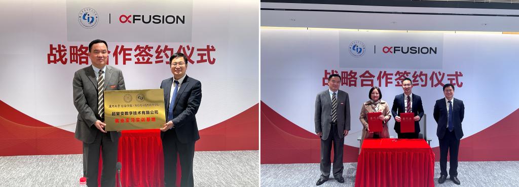 在超聚变数字技术有限公司,刘弢一行参观了X实验室,并同人力资源部总裁徐元君、算力服务领域总经理郝峰等企业领导、专家围绕共建特色化示范性软件学院、人才培养、项目落地等方面展开研讨座谈。信息学院软件工程系副主任王晓黎和超聚变福建区总经理沈金田分别代表信息学院和超聚变签订战略合作协议,刘弢和徐元君见签。刘弢为超聚变授厦门大学信息学院学生“就业实习实训基地”牌。