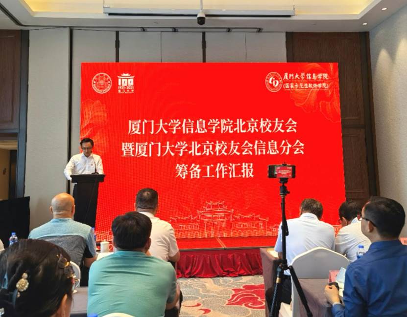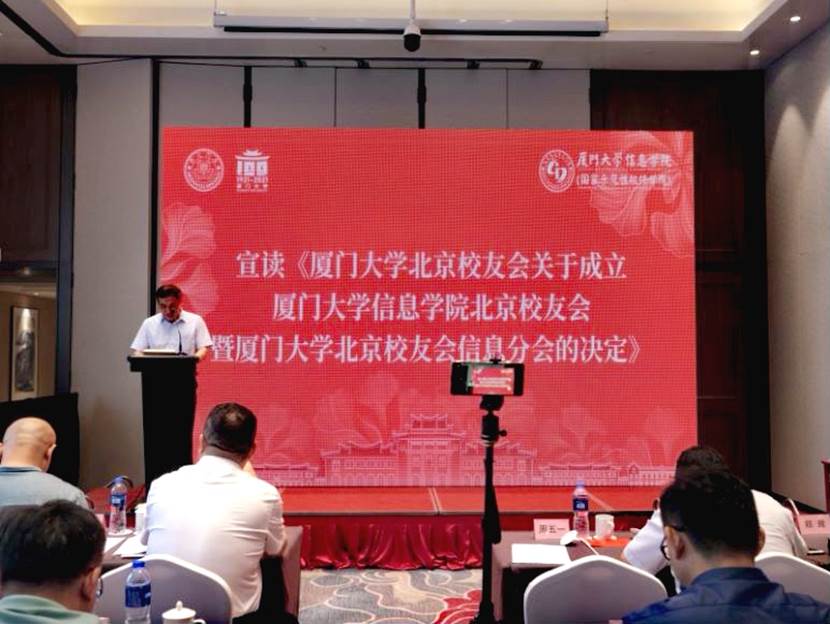 2021年7月18日下午,厦门大学信息学院北京校友会暨厦门大学北京校友会信息分会成立大会在北京市厦门大厦宴会厅隆重召开。学院党委书记刘弢、院长舒继武、党委副书记郑镇锋及老师代表,厦门大学校友总会秘书处副秘书长郑辉、秘书邓坤宜,厦门大学北京校友会会长周五一、理事成员及兄弟学院校友会代表,厦门大学信息学院贵州、上海、深圳、杭州校友会(候任)会长等出席大会,与百余位校友欢聚一堂,共同见证厦门大学信息学院北京校友会的成立。大会由厦门大学北京校友会副会长兼秘书长陈剑峰主持。