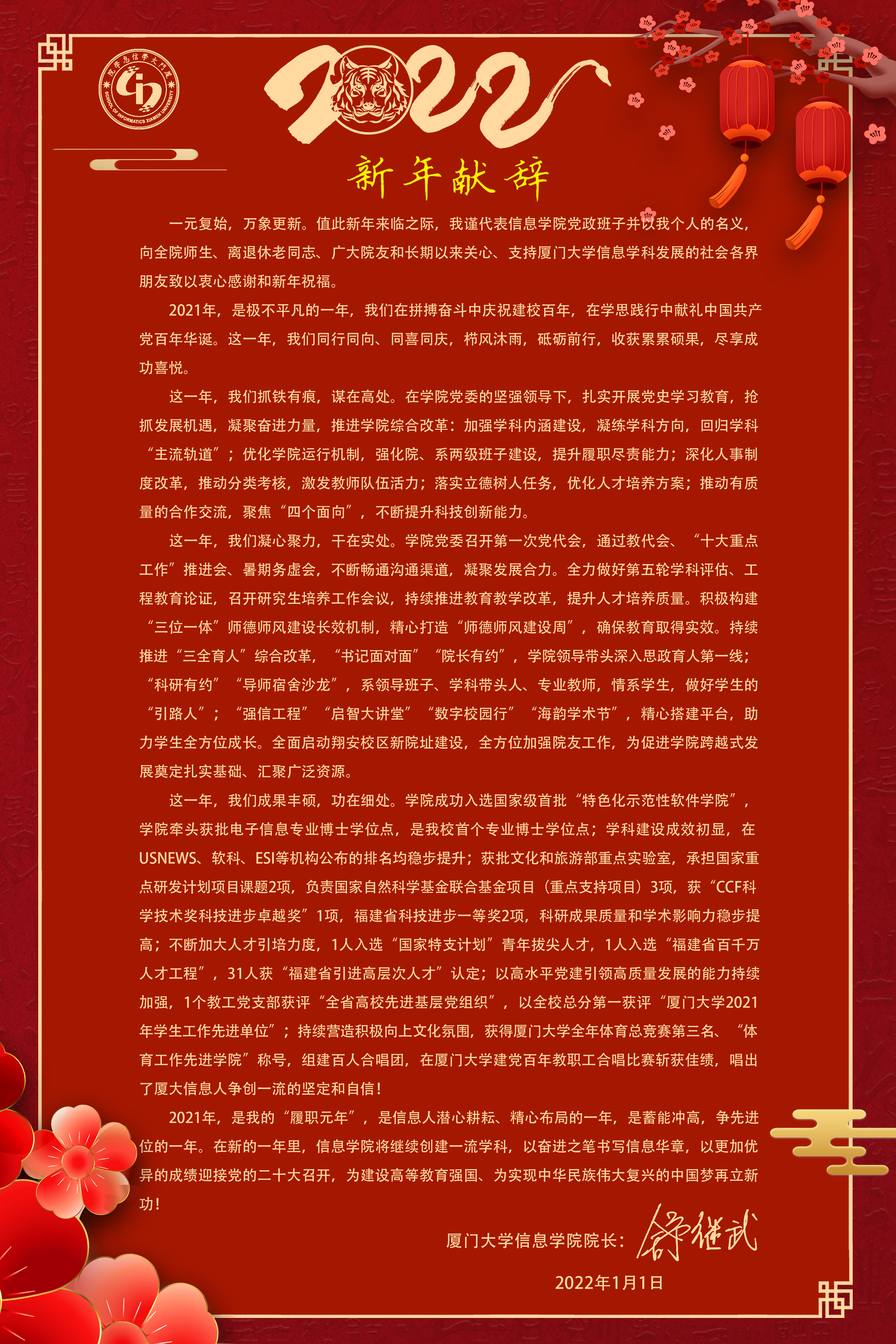 一元复始,万象更新。值此新年来临之际,我谨代表信息学院党政班子并以我个人的名义,向全院师生、离退休老同志、广大院友和长期以来关心、支持厦门大学信息学科发展的社会各界朋友致以衷心感谢和新年祝福。