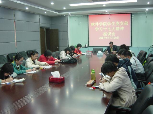 为推动十七大精神的学习在学院继续深入开展,了解和交流各党支部的学习贯彻情况,11月29日下午,软件学院在海韵园行政楼A栋304会议室召开学习贯彻十七大精神座谈会,学院党总支书记杨敬达、副书记夏侯建兵、辅导员、各党支部负责人和部分党员参加了座谈会。会议由杨敬达主持。