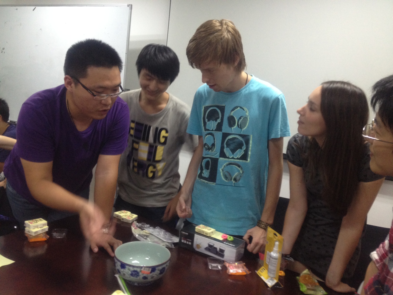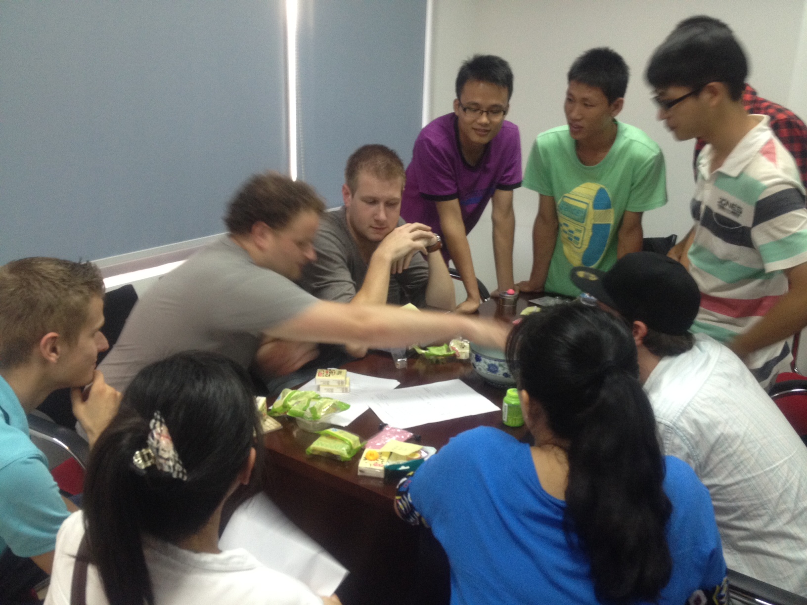 师生们分成四张桌子,桌上是宣传组同学袁应洁,丁苗,Hanna从网上购买的丰富多样的奖品。荷兰学生大部分是初次来到厦门接触博饼活动,但这并没减少他们参与的热情。通过中方同学的介绍及网络上的信息,他们对博饼规则并不陌生,在活动中很多荷兰同学都很“旺”,收获不少奖品。活动中同学们不时爆发出欢呼声,现场气氛热烈,每个同学都沉浸在欢乐之中。