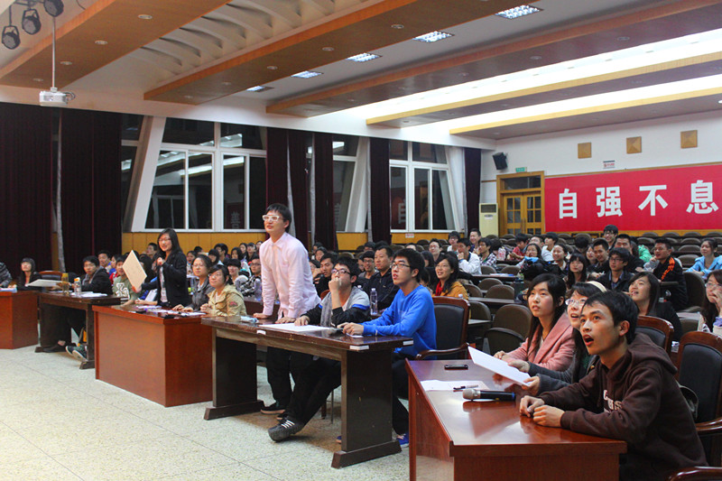知识竞赛由必答题、抢答题、限时题和风险题四部分组成,由于各队选手实力相当,必答题后各队比分几乎保持在同一水平线,直到紧张激烈的抢答题后才稍拉开分距。中场休息时,现场进行了简单有趣的人物猜测题,直接向现场答对题目的观众派发的精美小礼品也使得气氛达到高潮。随后,限时题和风险题环节,竞赛气氛显得异常激烈,选手们比拼实力的同时也在比拼着胆识和情绪控制能力。经过90分钟的角逐,各个奖项尘埃落定,比赛决出一等奖一名,二等奖两名,三等奖两名,其中冠军由2012级1班夺得。