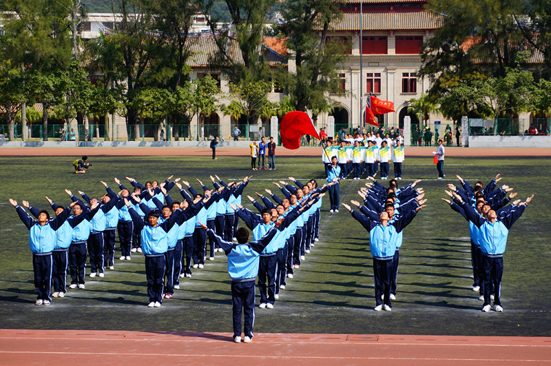 跟随着公共事务学院的队伍,我们第十四个进场,评审员举牌示意后,领操员领着队员们跑步进场,精神抖擞,队伍整齐。天蓝的院服伴着响亮的口号,犹如一片涛声震天的海洋,“软件学院,加油!加油!加油!”主席台上传来了雷鸣般的呐喊,继而广播操音乐响起,全场安静观望,随着一个动作的口令响起,软件人们齐刷刷地踏起了步,静止的海洋开始舞动:伸展运动,双手高举,仰望朝阳,那是对美好未来的向往;扩胸运动,坚定有力,停顿感强,那是对坚持不懈态度的诠释;跳跃运动,热情奔放、绽放青春,那是花样年华的华美展现。主席台旁边不断传来“好整齐”、“好有力度”的惊叹声,负责训练的学长和学姐终于长舒一口气,露出满意的笑容。