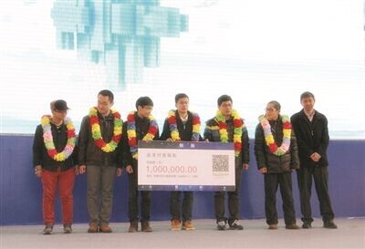 6人团队从阿里巴巴集团CTO王坚手上接过100万元支付宝支票 右(三)为柯国霖同学