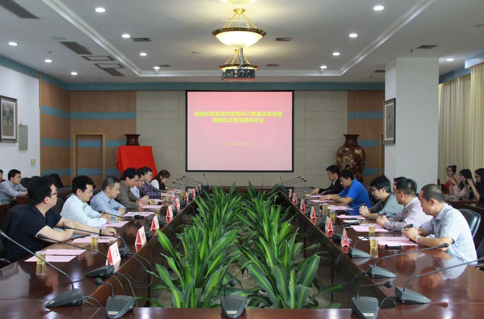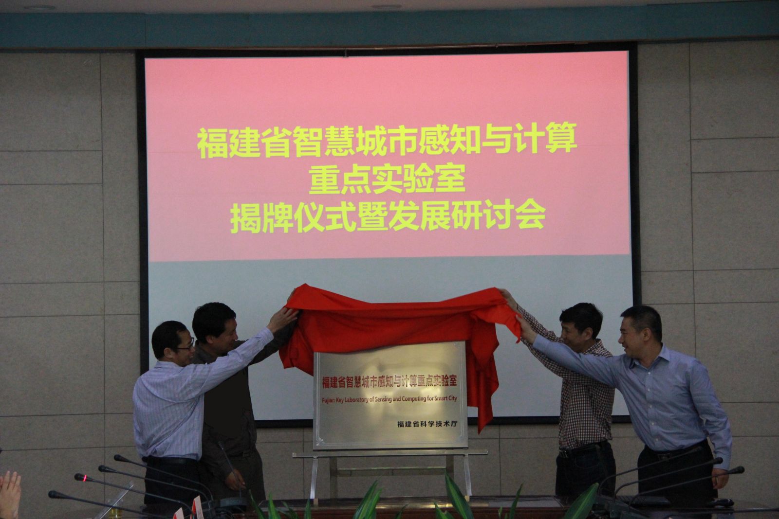 2015年4月18日上午,厦门大学“福建省智慧城市感知与计算重点实验室”揭牌仪式暨发展研讨会在嘉庚主楼215会议室顺利召开。揭牌仪式由我院副书记李承华主持。参加此次揭牌仪式的有:福建省科技厅基础研究处处长吴立增,市委办-市经济和信息化局软件服务业处处长许文恭,市创建国家信息消费示范城市领导小组办公室范晓亮,市公安局交通警察支队科技设施处副处长金国新,市智慧城市产业创新战略联盟理事长、银江智慧城市技术有限公司董事长汪卫东,厦门卫星定位应用有限公司总经理常兴斌,厦门大学科技处副处长毛通双,信息学院党委书记黄鸿德,信息学院副院长王程,信息学院党委副书记李承华,建筑与土木工程学院副院长雷鹰,信息学院闽江特聘教授王菡子教授、纪荣嵘教授,环境生态学院黄金良教授,以及来自与智慧城市相关的信息学院、环境生态学院、建筑与土木工程学院的重点实验室教师代表。
