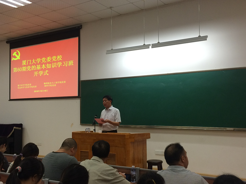 10月18日上午8:30,由数学科学学院党委、物理机电与工程学院党委、信息科学与技术学院党委、软件学院党委联合举办、由软件学院党委承办的“党委党校第60期党的基本知识学习班”开班典礼在海韵园物理机电航空大楼117报告厅隆重举行。软件学院党委董槐林书记、刘钟南副书记、数学科学学院党委郑诚明副书记、厦门大学特邀党建组织员陈道乾老师以及本期党校的各位带队老师和参训的162名入党积极分子参加了党校开班典礼。开班典礼由软件学院党委刘钟南副书记主持。