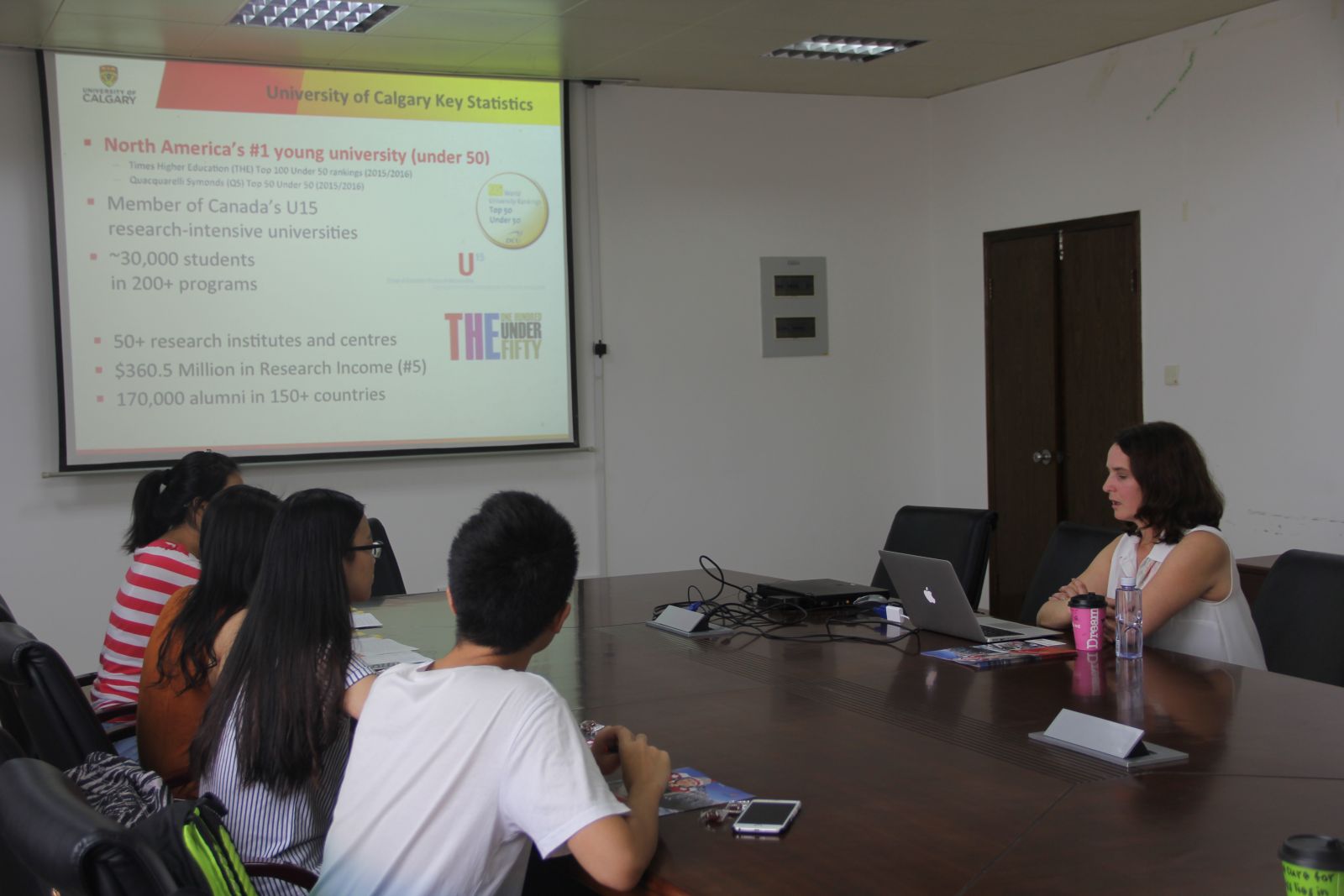 会谈前,Cindy副院长为我院同学做了一场精彩的宣讲报告,详细介绍了卡尔加里大学、科学院及2+2项目的相关情况,并耐心回答了同学们关于项目的疑问。