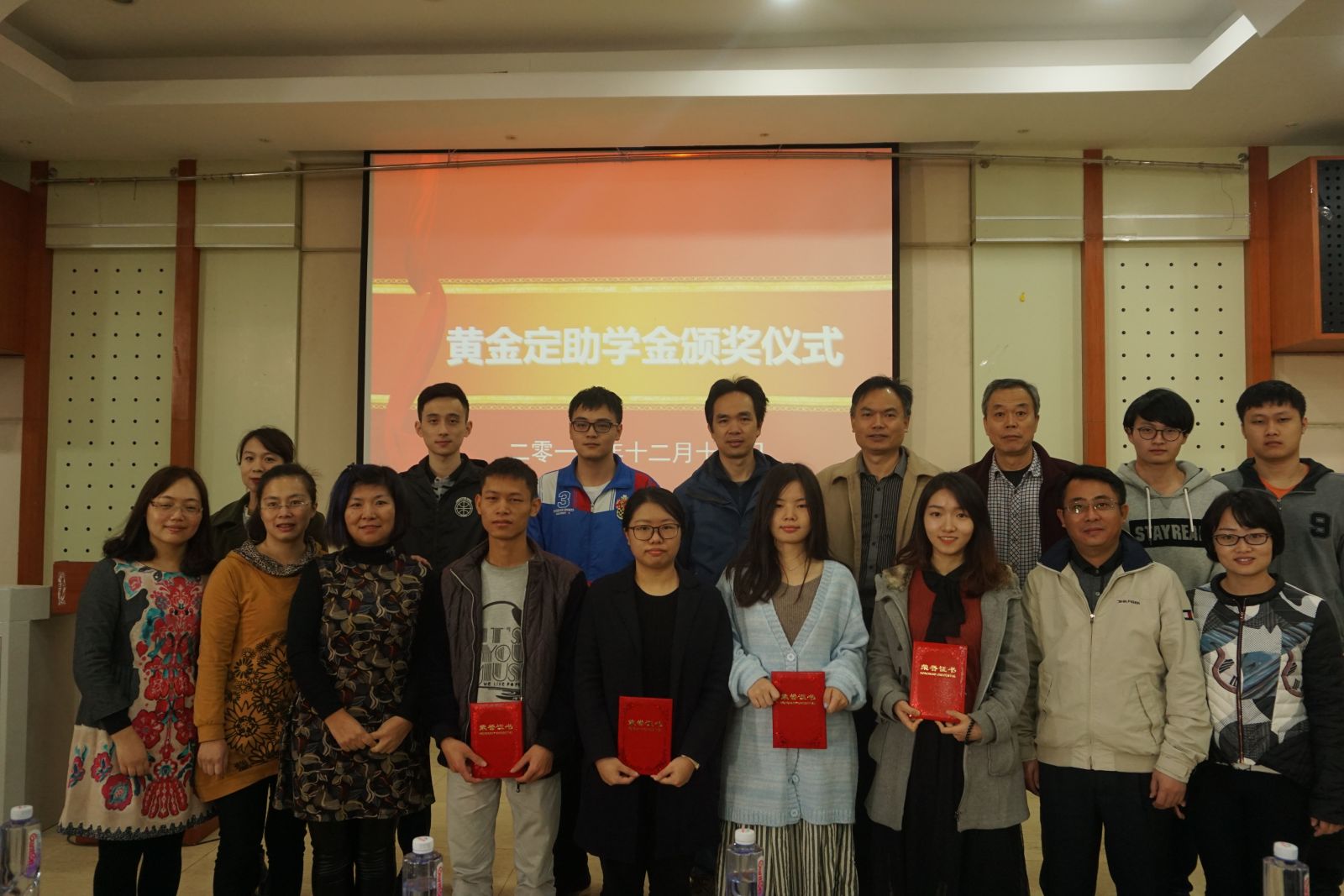 接着,主持人宣布本次黄金定助学金的获奖名单并进行颁奖仪式。本次设立特等奖、优异奖和优秀奖三个奖项。黄冠同学作为获奖学生代表上台发言,他在发言中谈了自己的求学经历、对曾经给予自己帮助的各界单位和人士的感谢以及自己的专业学习情况,并在最后表达了自己对给予资助的企业、学校、老师以及同学们的美好祝愿。