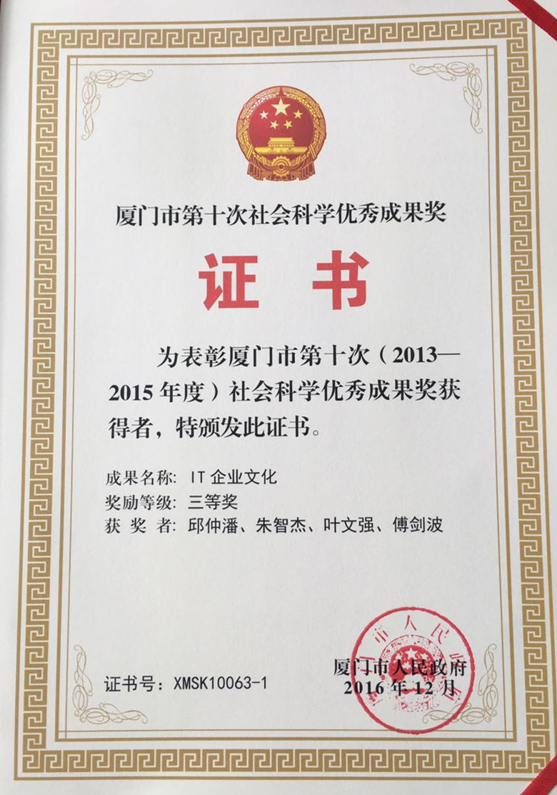 厦门市第十次社会科学优秀成果奖颁奖大会近日在厦门宾馆举行,我院邱仲潘老师编写的教材《IT企业文化》获得三等奖。该教材作者共四人:邱仲潘-厦门大学信息学院副教授、信息与网络中心副主任,讲授该门课程三年;朱智杰-厦门市安监局处长、经济师,厦门市中小企业协会顾问;叶文强-厦门智慧传承文化咨询有限公司合伙人、经济师;傅剑波-厦门智慧传承文化咨询有限公司合伙人、一级人力资源管理师。
