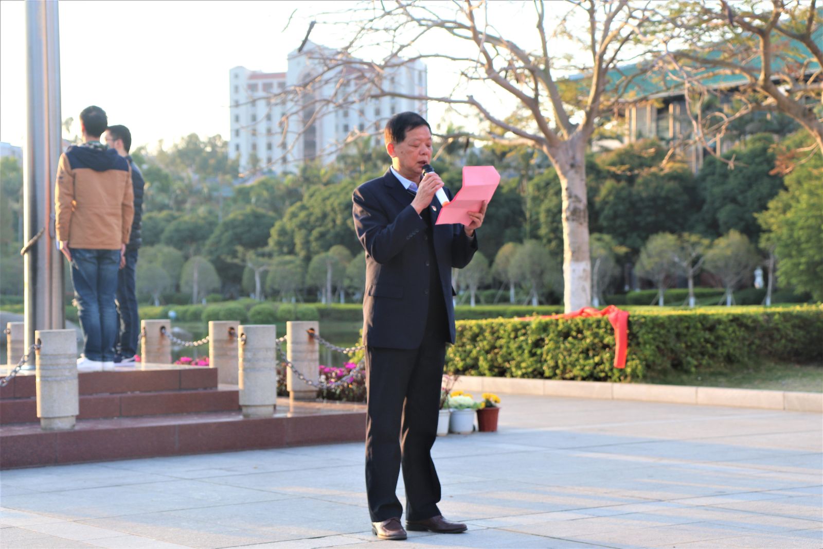 接下董槐林书记致辞,他与同学们分享了三点感触。第一,升国旗是慎终追远的典礼,五星红旗是中华人民共和国的象征,是全体中华儿女的共同尊严,升国旗奏国歌是缅怀先烈、热爱祖国的典礼。其次,升国旗是家国情怀的礼赞,每位同学都应该把延续五千年的家国情怀融入内心深处,诚其意,正其心,修其身。最后,升国旗也是时代责任的担当,同学们尤其是党员同志们应当不断地勤奋学习、增长本领,发挥先锋模范作用。