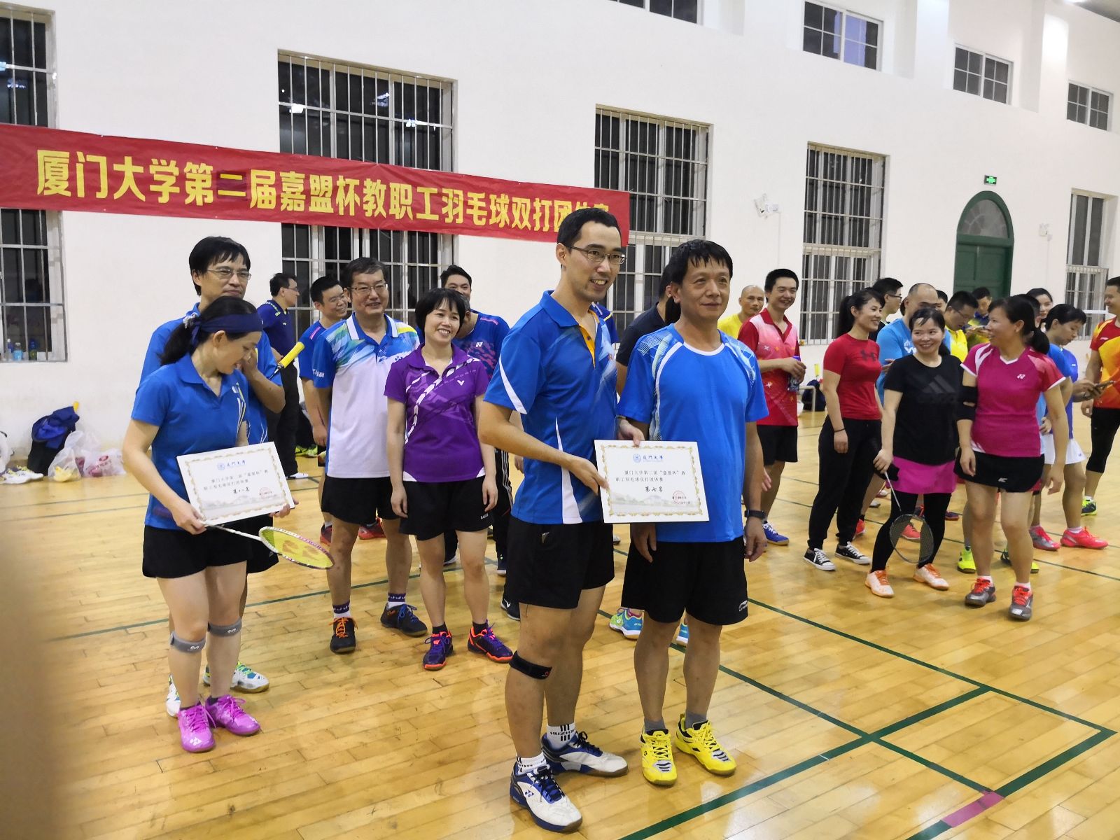 为贯彻落实《全民健身计划纲要》,丰富广大教职工业余文化体育生活,促进和谐校园建设,应广大羽毛球爱好者的要求,校工会于11月24日25日两天在思明校区三家村风雨球馆举办了第二届“嘉盟杯”教职工羽毛球双打团体赛,软件学院羽毛球队展现了良好的风貌和状态,最终获得第七名。