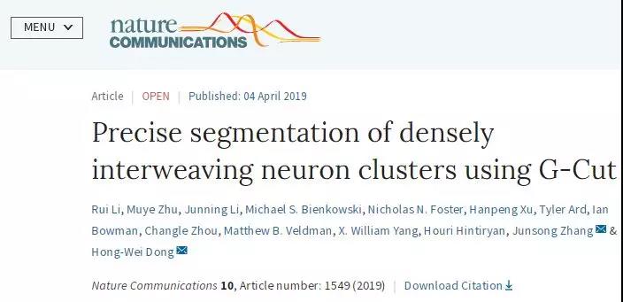 2019年4月2日,我院张俊松团队联合南加州大学Hong-WeiDong团队在Nature Communications上发表题为“Precise segmentation of densely interweaving neuronclusters using G-Cut”的文章,实现我院在Nature子刊发文的零突破。