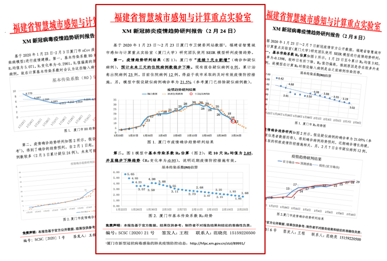 2020年1月24日起,厦门大学信息学院王程教授、范晓亮高工团队积极响应厦门大学鼓励科技人员助力疫情防控号召,组织六名硕士生和本科生在线成立新冠疫情数据分析研究攻关小组。团队远程协作、形成合力,积极开展技术攻关,为厦门市交通运输局、厦门市卫健委等部门提供了疫情趋势研判分析、交通疫情数据分析等算法支撑,为我市相关部门疫情防控决策部署提供重要参考依据。