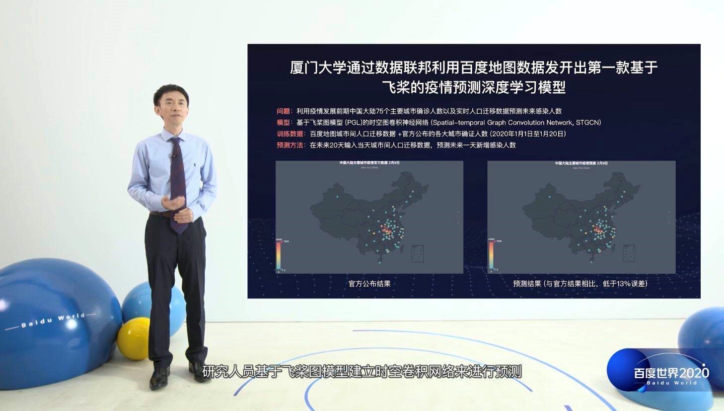 新冠肺炎疫情的暴发给全人类带来共同挑战,通过多尺度的人群移动与环境空间大数据,分析病毒传播的时空特性、精准预测病毒的传播风险,将极大有助于刻画病毒传播路径、建立公共卫生哨兵网络和提供防疫决策支持。疫情暴发伊始,我院王程教授科研团队特任副研究员陈龙彪博士迅速组织2017级本科生王志源、朱航等学生团队,与百度研究院大数据实验室熊昊一博士、刘吉研究员等组成联合团队攻关战疫,研发出第一款基于百度飞桨(PaddlePaddle)自主深度学习平台的疫情风险预测模型,并于2020年9月15日通过央视在百度世界2020大会发布。